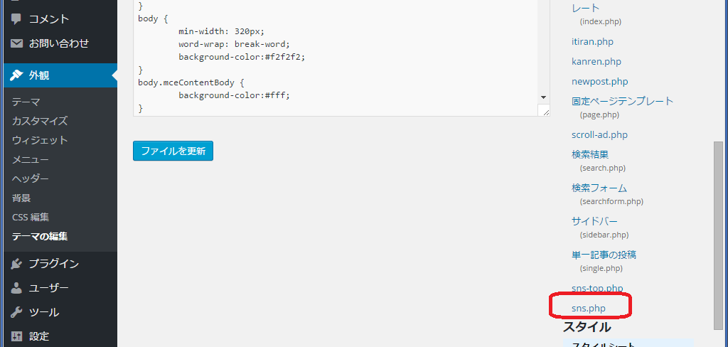 sns.phpを開いて編集する